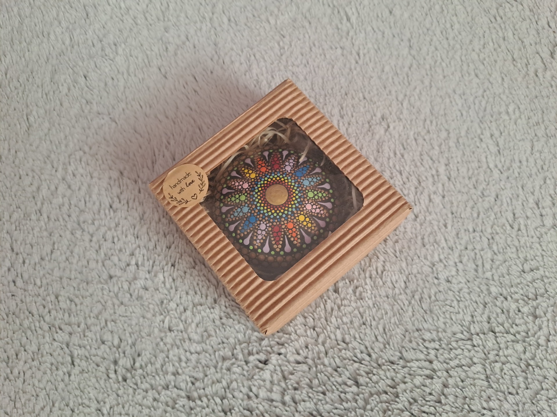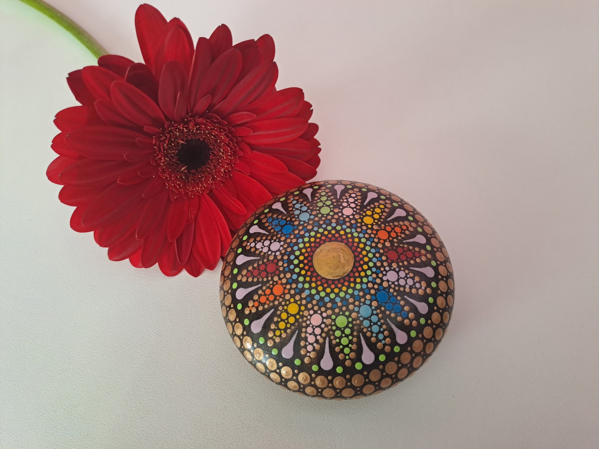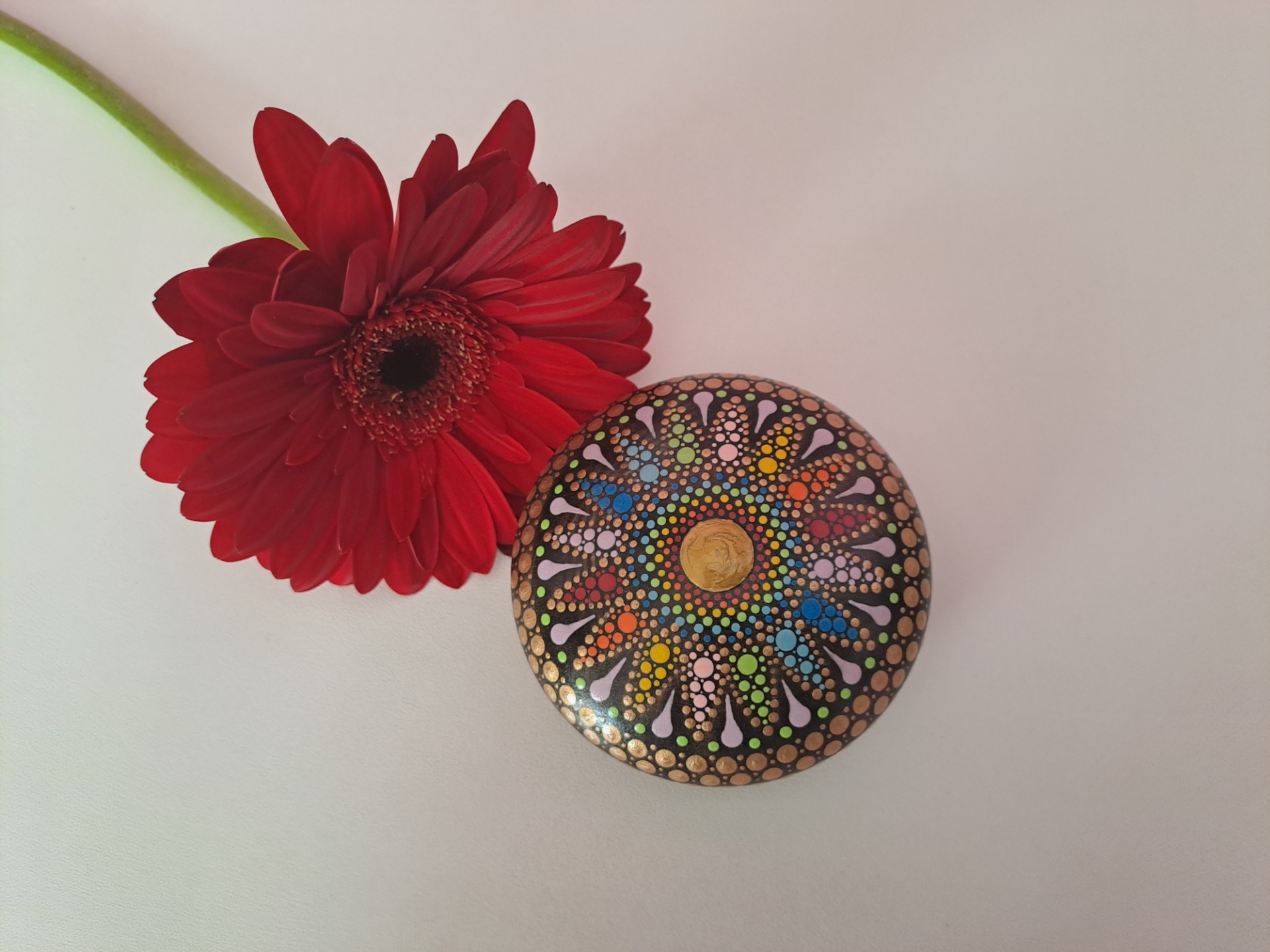 Autorská Dot malba na odlitku kamene o průměru 7,5 cm.