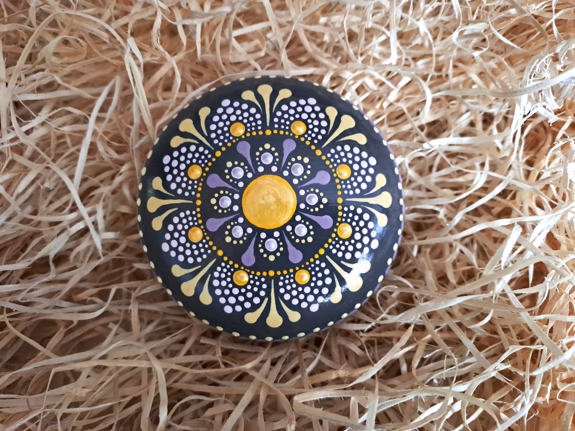 Autorská Dot malba na odlitku kamene o průměru 7,5cm a výšce
